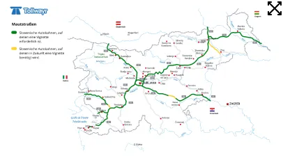 Regionale veje i Slovenier er undtaget fra kravet om en vignet. Herudover betales A2 motorvejen fra Rosenbach (Østrig) til Hrušica (Slovenien) gennem Karawankstunnelen. Ruten fra Slovenien til Østrig (nordgående retning) kan ikke forudbetales. Du skal betale med kort eller kontanter ved vejafgiftsstandere.