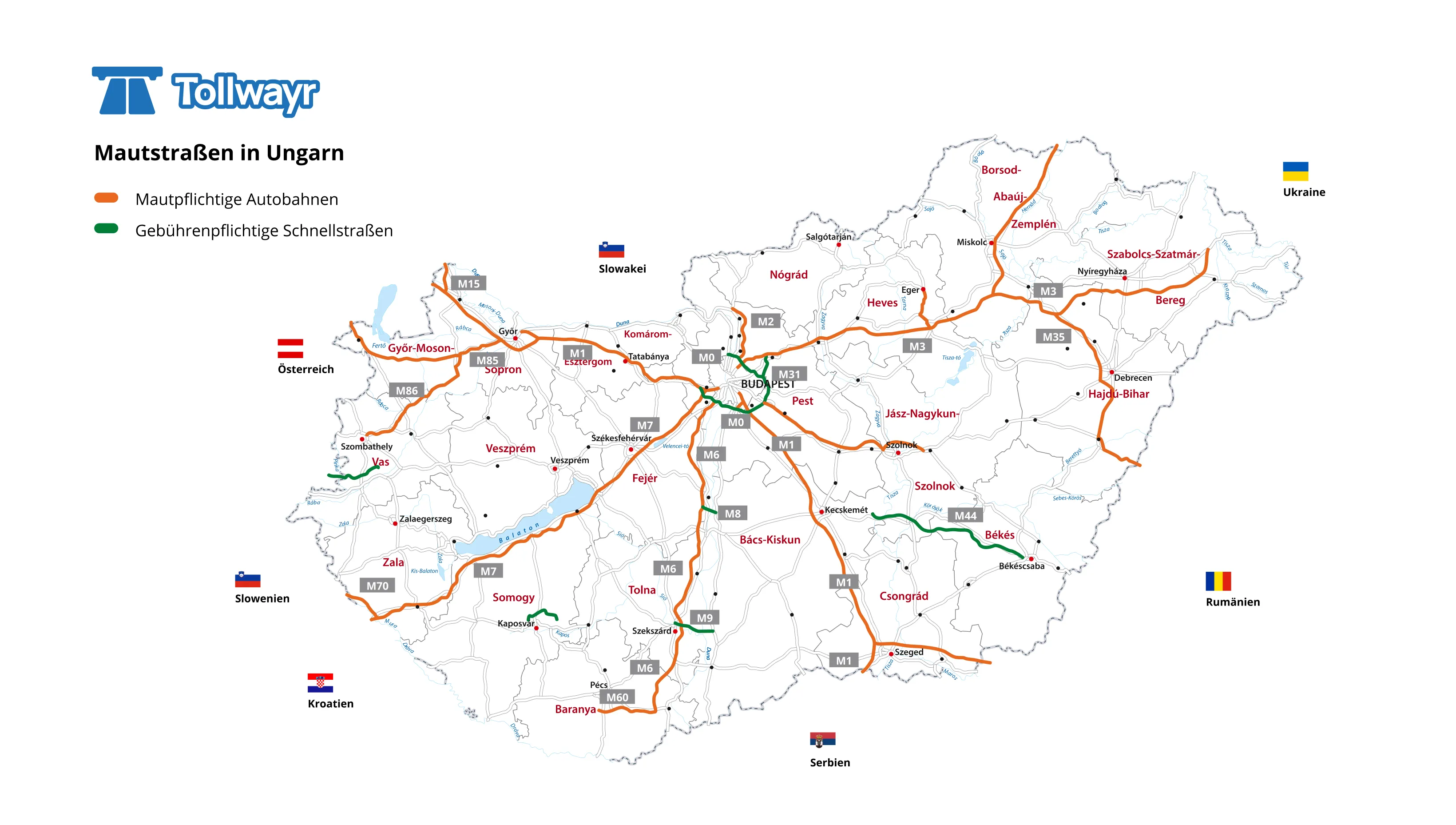Toutes les voies rapides et autoroutes à péage sont désignées par le "M" ou e-Matrica. Une e-vignette hongroise valide est requise pour toutes les autoroutes suivantes du pays :L'étendue régionale de la validité de toutes les vignettes est l'ensemble du pays de Hongrie, à l'exception des vignettes de comté. Les vignettes départementales ne sont valables qu'une fois par an, pour la portion de route située dans le département, jusqu'à la première sortie du département voisin.